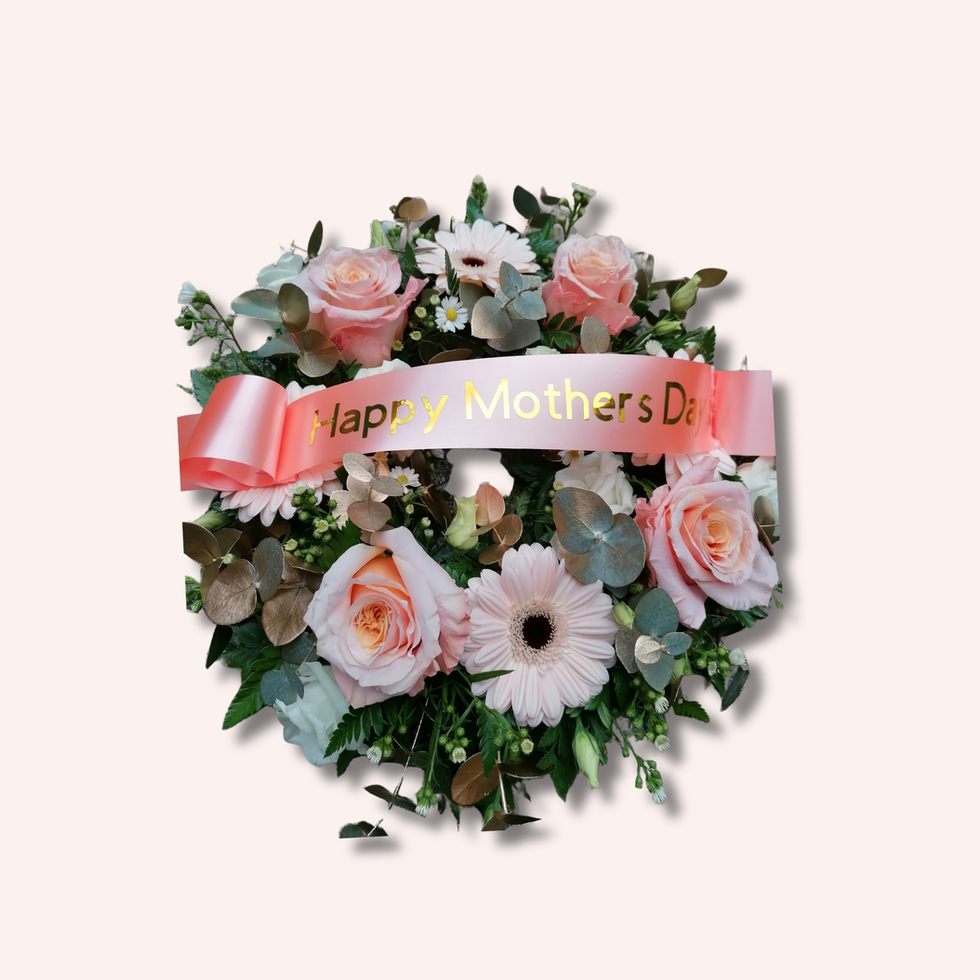 A soft and heartfelt tribute to honour a much-loved Mum or Grandma. Delicate seasonal blooms and fresh foliage are gathered into a timeless wreath, finished with a ribbon for your Mother’s Day message.